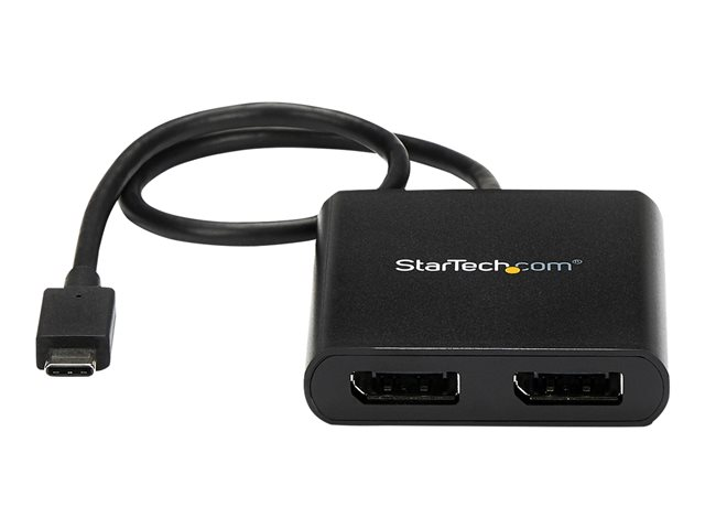 Med denna MST-hubb kan du ansluta två DisplayPort-skärmar till din USB-C -dator. MST fungerar på alla Windows -enheter med DP alt-läge över USB Type-C , som till exempel modeller av bärbara Dell Precision - och Dell XPS -datorer. MST-hubben strömförses från USB-C-porten, så du behöver ingen extra strömadapter. Denna adapter fungerar med USB Type-C-enheter som passerar en DisplayPort-videosignal och den är dessutom kompatibel med Thunderbolt 3-portar. Öka din produktivitet med flera skärmar De nyaste generationerna av bärbara datorer är bärbarare än någonsin. Tyvärr kan det innebära att du får färre videoutgångar och en liten inbyggd skärm. MST-hubben löser dessa problem genom att låta dig ansluta två oberoende skärmar till en USB-C-port på din dator så att multitasking blir mycket enklare. Om du använder MST-hubben kan du utöka ditt skrivbord till extra skärmar och strömma oberoende innehåll till varje skärm. Detta gör det enklare att multitaska och öka din produktivitet - perfekt för att skapa en hot desk-lösning som är enkel att docka med en trådlös uppsättning av tangentbord och mus. Hubben kan dessutom spegla samma bild till flera skärmar för fjärrvisning på till exempel digitala skyltar. Enastående bildkvalitet som inte tömmer systemets resurser MST-teknik använder ditt befintliga videokort för att minimera användningen av systemets resurser och samtidigt ge Ultra HD 4K-upplösningar. 4K stöds av de senaste A/V-enheterna och ger fyra gånger högre upplösning än 1080p. Eftersom MST-hubben kan sända HD i 1080p är den dessutom perfekt för alla högupplösta applikationer som till exempel grafisk design och CAD-ritningar. Fungerar med alla skärmar, TV-apparater och projektorer Med denna MST-hubb kan du använda separata DP-videoadaptrar för att ansluta HDMI-, VGA- eller DVI-skärmar, för kompatibilitet med alla dina befintliga skärmar. Hubben stöder DP 1.2-kapabla system för sömlös integrering med din befintliga videoutrustning. MSTCDP122DP stöder plug-and-play för en problemfri installation och täcks av StarTech.coms 2-årsgaranti och gratis livstidsgaranti på teknisk support. Obs.: Din USB-C-utrustade enhet måste ha stöd för video (DP Alt-läge) för att fungera med denna adapter. MST delar 21,6 Gbps över alla anslutna skärmar. Högre upplösningar kan begränsa bandbredden på resterande portar. Se våra riktlinjer nedan för att hitta idealisk upplösning för din situation. Genomsnittlig upplösning bandbreddsallokering 1920x1080 (HD 1080p) @ 60 Hz - 22 % 1920x1200 @ 60 Hz - 30 % 2560x1440 @ 60 Hz - 35 % 2560x1600 @ 60 Hz - 38 % 3840x2160 (Ultra HD 4K) @ 30 Hz - 38 % Att gå över 100 % reducerar funktionaliteten.