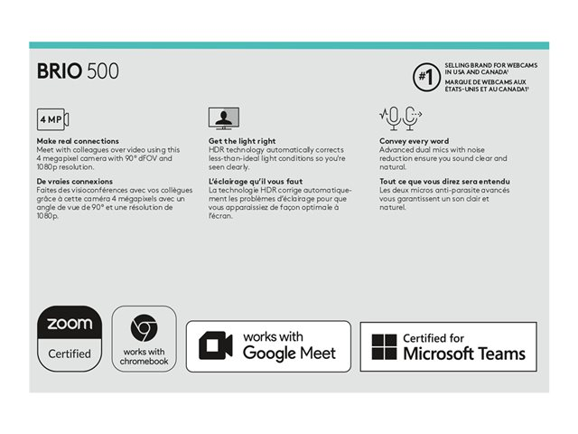 Logitech BRIO 500 - Webbkamera - färg - 1920 x 1080 - 1080p, 720p - ljud - USB-C