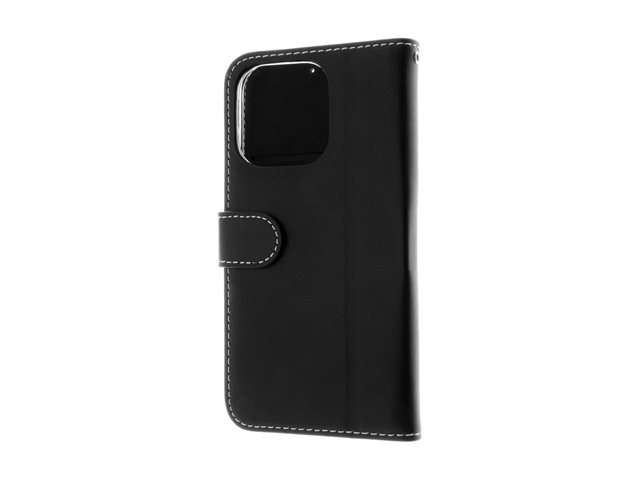 Insmat Exclusive - Vikbart fodral för mobiltelefon - genuint läder, kartong+papper+aluminiumfolie, polykarbonat (PC), bomullssömmar - svart - för Apple iPhone 16 Pro