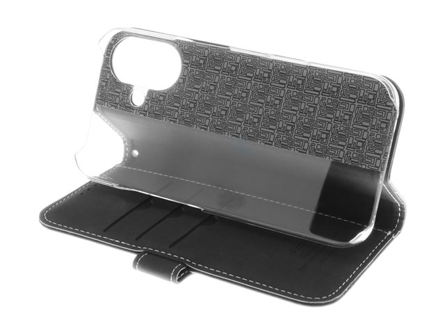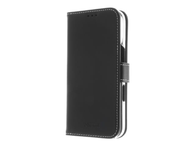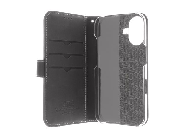 Insmat Exclusive - Vikbart fodral för mobiltelefon - genuint läder, kartong+papper+aluminiumfolie, polykarbonat (PC), bomullssömmar - svart - för Apple iPhone 16 Plus