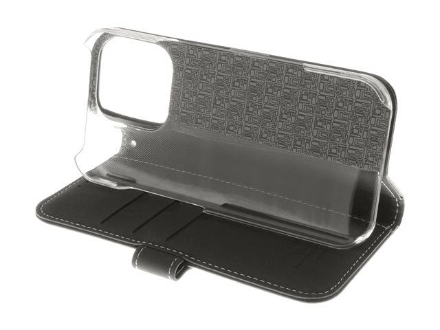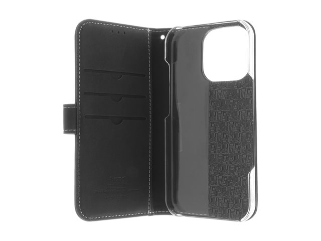 Insmat Exclusive - Vikbart fodral för mobiltelefon - genuint läder, kartong+papper+aluminiumfolie, polykarbonat (PC), bomullssömmar - svart - för Apple iPhone 16 Pro 650-3280