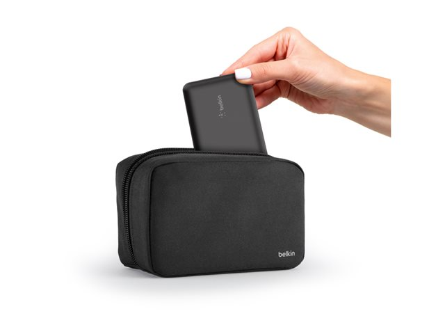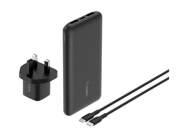 Belkin BoostCharge - Power bank + växelströmsadapter - 10000 mAh - 3 utdatakontakter (USB-C, 2 x USB) - på kabel: USB-C - Storbritannien - med fickfodral med dragkedja