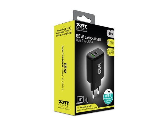 PORT Connect - Strömadapter - GaN - 65 Watt - 3.25 A - PD, QC 3.0 - 2 utdatakontakter (USB typ A, USB-C) - Europa
