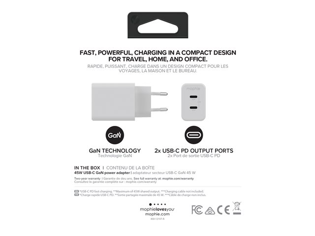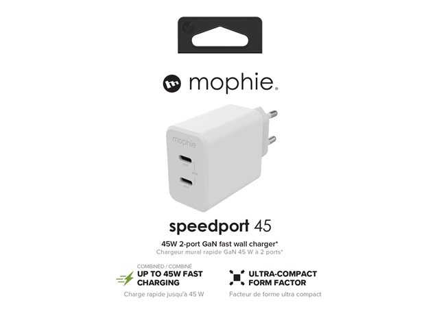mophie speedport 45 - Strömadapter - 45 Watt - Fast Charge, PD - 2 utdatakontakter (24 pin USB-C) - vit - Europa