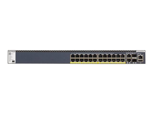 | Gränssnitt | 2 x 10GBase-T RJ-45 2 x 10GBase-X SFP+ 1 x hantering (Gigabit LAN) RJ-45 1 x seriell (RS-232) RJ-45 1 x konsol (mini-USB) 1 x USB Type A 24 x 1000Base-T RJ-45 PoE+ |