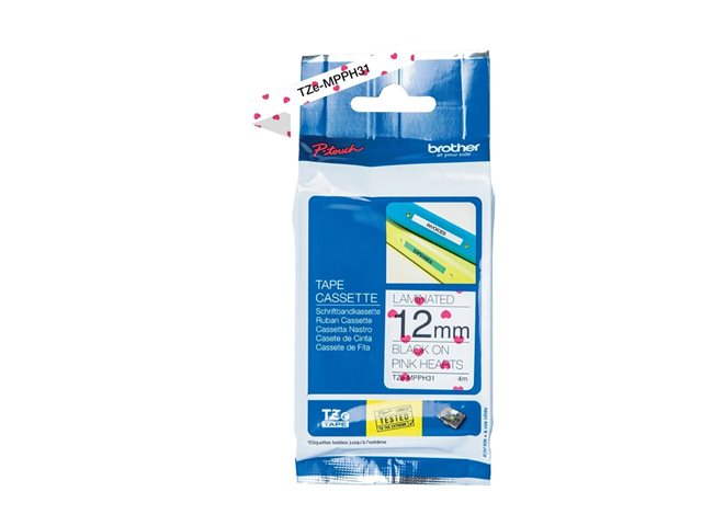 Brother TZe-MPPH31 - Svart på rosa hjärtan - Rulle (1,2 cm x 4 m) 1 kassett(er) bandlaminat - för Brother PT-H110; P-Touch PT-E310, H110; P-Touch Cube PT-P300; P-Touch Embellish PT-D215