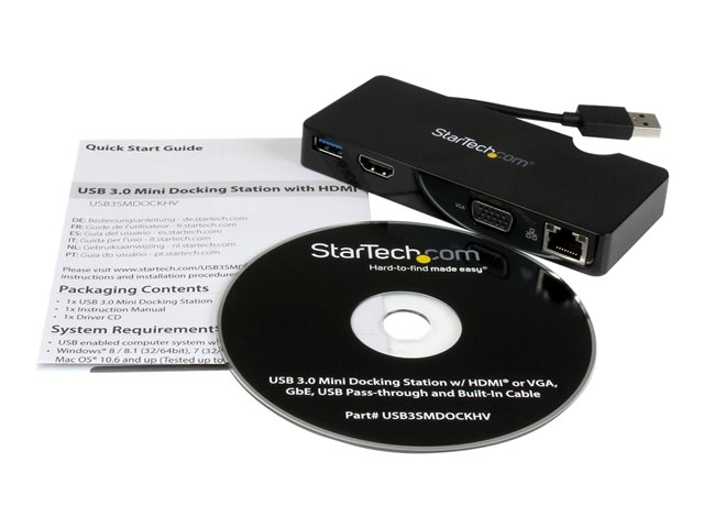 StarTech.com USB 3.0 to HDMI or VGA Adapter Dock - USB 3.0 Mini Docking Station w/ USB, GbE Ports - Portable Universal Laptop Travel Hub (USB3SMDOCKHV) - Dockningsstation - USB - HDMI - 1GbE - för P/N: ARMPIVOT, ARMPIVOTE, ARMPIVSTND, ARMSLIM, ARMUNONB