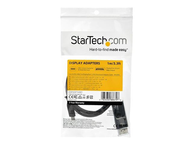 StarTech.com USB C till DisplayPort 1.2-kabel på 1 m för 4K vid 60 Hz - dubbelriktad vändbar videokabeladapter för DP till USB-C eller USB-C till DP - HBR2/HDR - USB Type C/TB3-skärmkabel - DisplayPort-kabel - 24 pin USB-C (hane) till DisplayPort (hona) - USB 3.1 / Thunderbolt 3 / DisplayPort 1.2 - 1 m - stöd för 4K, aktiv - svart