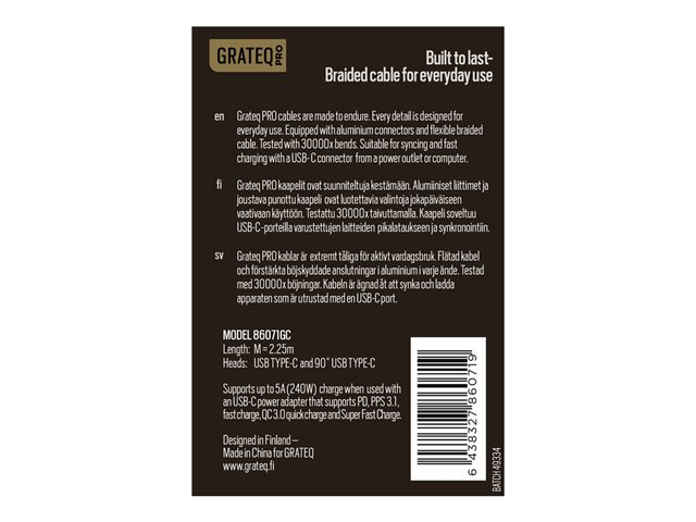GRATEQ PRO - USB-kabel - USB-C (hane) till USB-C (hane) vinklad - 5 A - 2.25 m - USB-strömförsörjning (240W) - vit