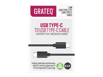 GRATEQ - USB-kabel - 24 pin USB-C (hane) till 24 pin USB-C (hane) - 5 A - 1 m - USB-strömförsörjning (100W) - svart