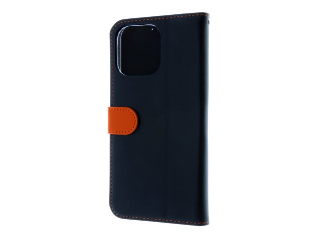 Insmat Exclusive - Vikbart fodral för mobiltelefon - genuint läder, polykarbonat, kartong+papper+aluminiumfolie, bomullssömmar - svart/orange - för Apple iPhone 15 Pro Max