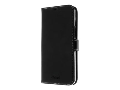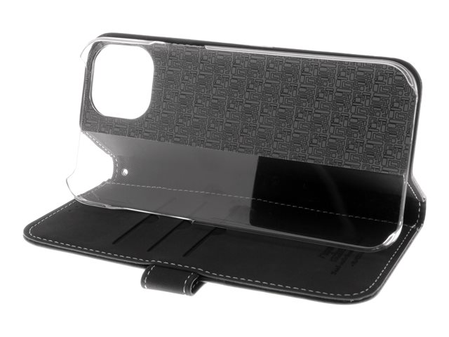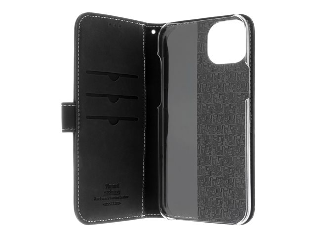 Insmat Exclusive - Vikbart fodral för mobiltelefon - genuint läder, polykarbonat, kartong+papper+aluminiumfolie - svart - för Apple iPhone 15 Plus