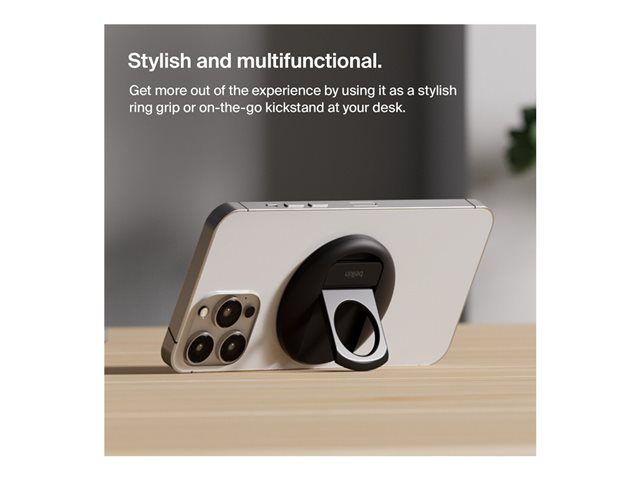 | Allmänt |  | Typ av produkt | Magnetisk montering |  | Avsedd för | Mobiltelefon |  | Integrerade komponenter | Mobilställ, ringgrepp |  | Justeringar | Rotation |  | Bredd | 10.1 cm |  | Djup | 2.1 cm |  | Höjd | 10.16 cm |  | Vikt | 0.15 kg |  | Färg | Svart |  | Diverse |  | Egenskaper | Liggande orientering, stående orientering |  | Tillverkarens garanti |  | Service och support | Begränsad garanti - 2 år |  | Kompatibilitetsinformation |  | Designat för | Apple iPhone 12, 12 mini, 12 Pro, 12 Pro Max, 13, 13 mini, 13 Pro, 13 Pro Max, 14, 14 Plus, 14 Pro, 14 Pro Max, 16, 16 Plus, 16 Pro, 16 Pro Max Apple MacBook Air (13.3 tum, I mitten av 2022, M1, M2, Sent 2018, Sent 2020, Tidigt 2020)