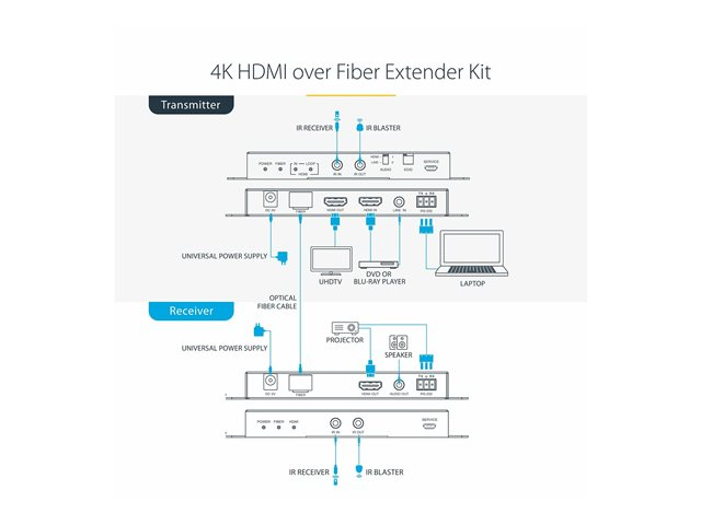 Detta HDMI over Fiber Extender Kit förlänger en Ultra HD (UHD) 4K 60 Hz HDMI-signal, med 7.1ch-ljud, upp till 3300 fot via Single Strand LC-fiberkabel. Detta konverteringskit innehåller både sändare och mottagare för en komplett end-to-end-lösning.