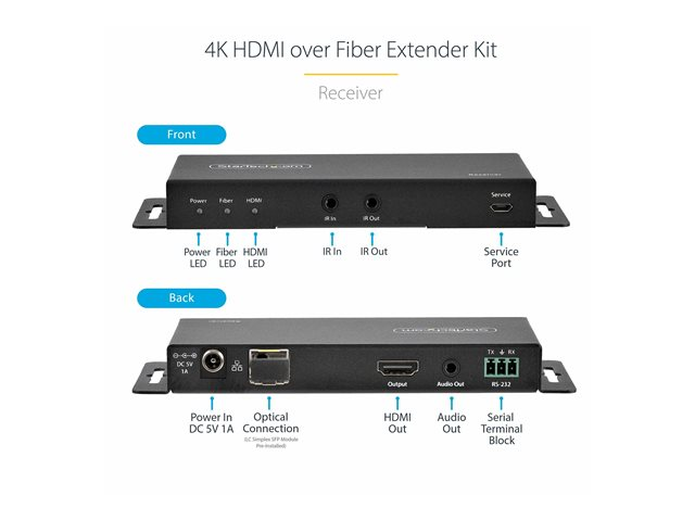 StarTech.com 4K HDMI over Fiber Extender Kit, 4K 60Hz up to 3300ft/1km (Single Mode) or 1000ft/300m (Multimode) LC Fiber Optic, HDR/HDCP, Audio/RS232/IR Extender, HDMI Video Extender - Transmitter and Receiver Kit (ST121HD20FXA2) - Video/ljud/infrarröd/nätverksförlängare - HDMI - över fiberoptik - fiberoptisk - upp till 1 km ST121HD20FXA2