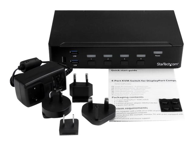 StarTech.com DisplayPort KVM-switch med 4 portar - USB 3.0 - 4K 30 Hz - Omkopplare för tangentbord/video/mus/USB - 4 x KVM/ljud/USB + 3 x SuperSpeed USB - 1 lokal användare - rackmonterbar - Växelström 120/230 V/likström 9 - 12 V - för P/N: SV431RACK